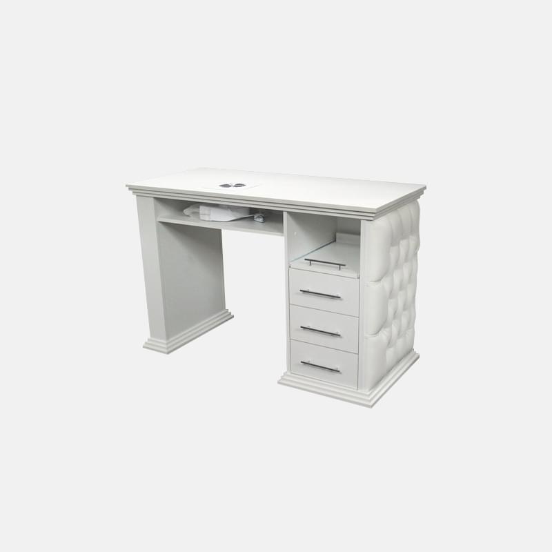 Оригинальный столик для мастера маникюра «Лучиано» подойдет тем, кто ищет функциональную, практичную, но при этом достаточно компактную модель. Под столешницей может быть установлена вытяжка, имеется вместительная тумба на три выдвижных ящика и одну нишу.