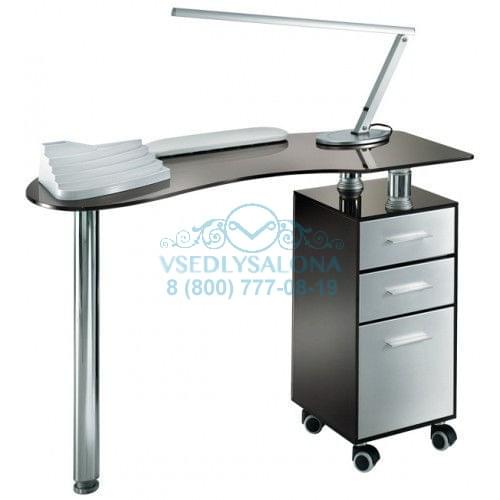 Маникюрный стол «Хирономо» - для тех, кто ищет по-настоящему изысканные решения для своего маникюрного салона или кабинета. Оригинальная форма столешницы, хромированные ножки, вместительная тумба – все это здесь. На нижней полке может быть установлена вытяжка для еще более комфортной работы мастера маникюра.