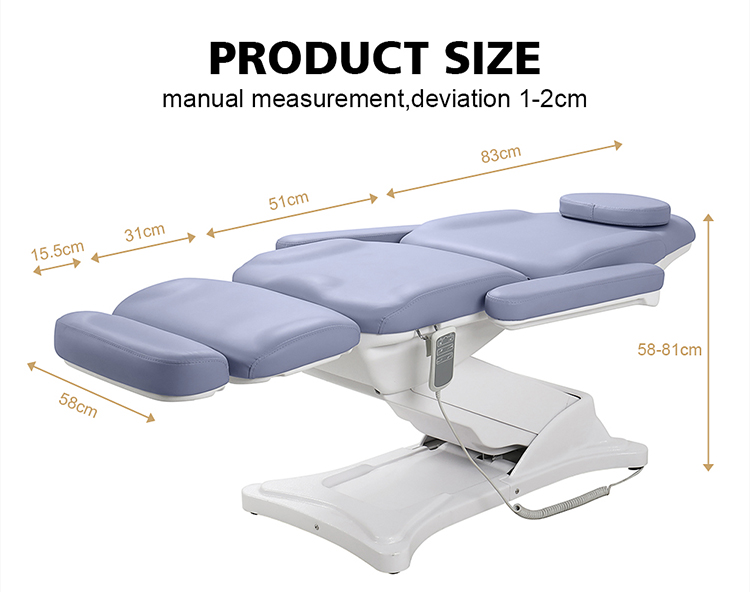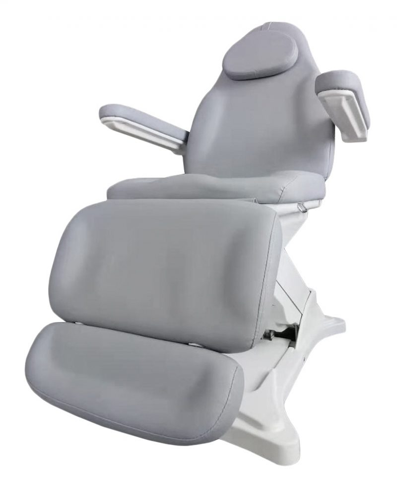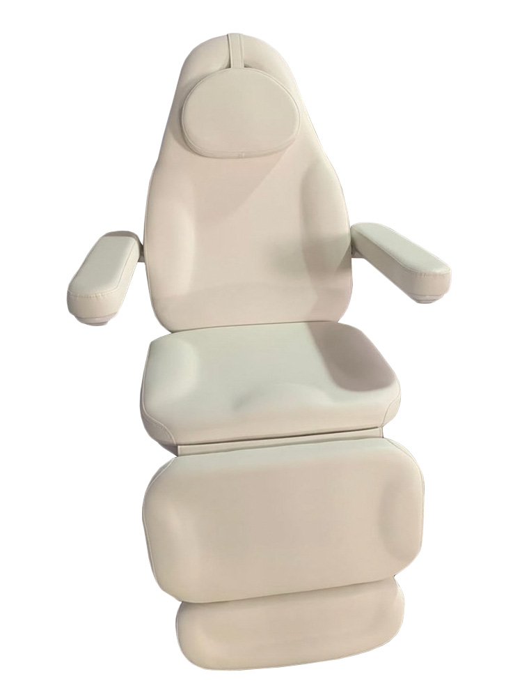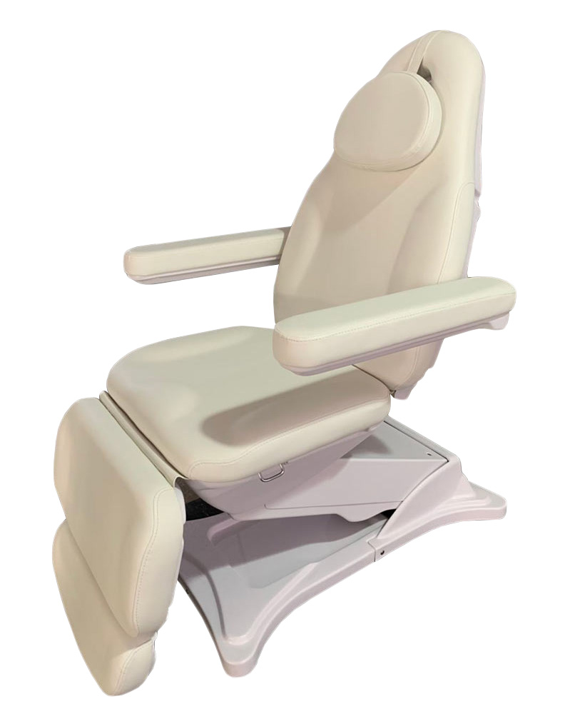 Оснащено тремя электромоторами для контроля высоты, угла наклона спинки и ножной части, подвижные подлокотники, подголовник с отверстием для лица. Высококачественная и легкоочищаемая обивка из экокожи. Элегантный, изящный, утонченный дизайн