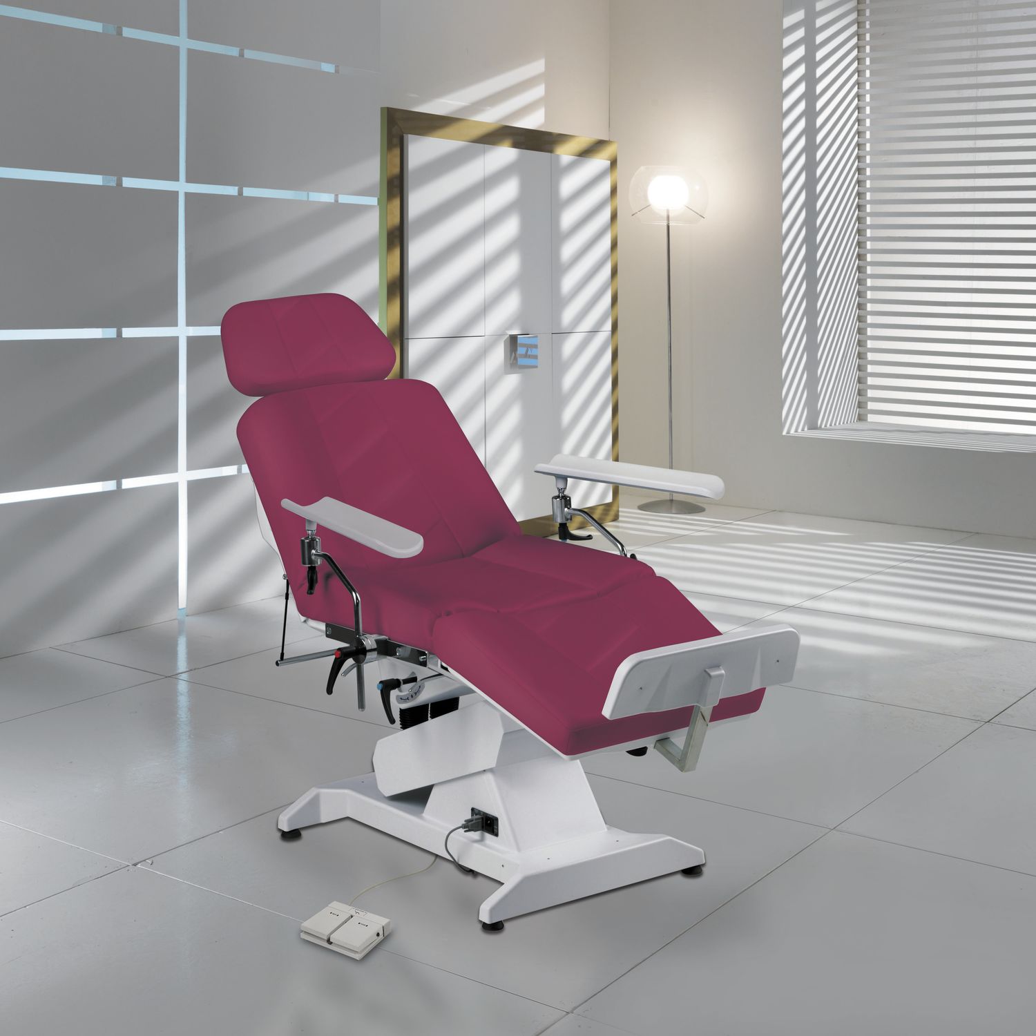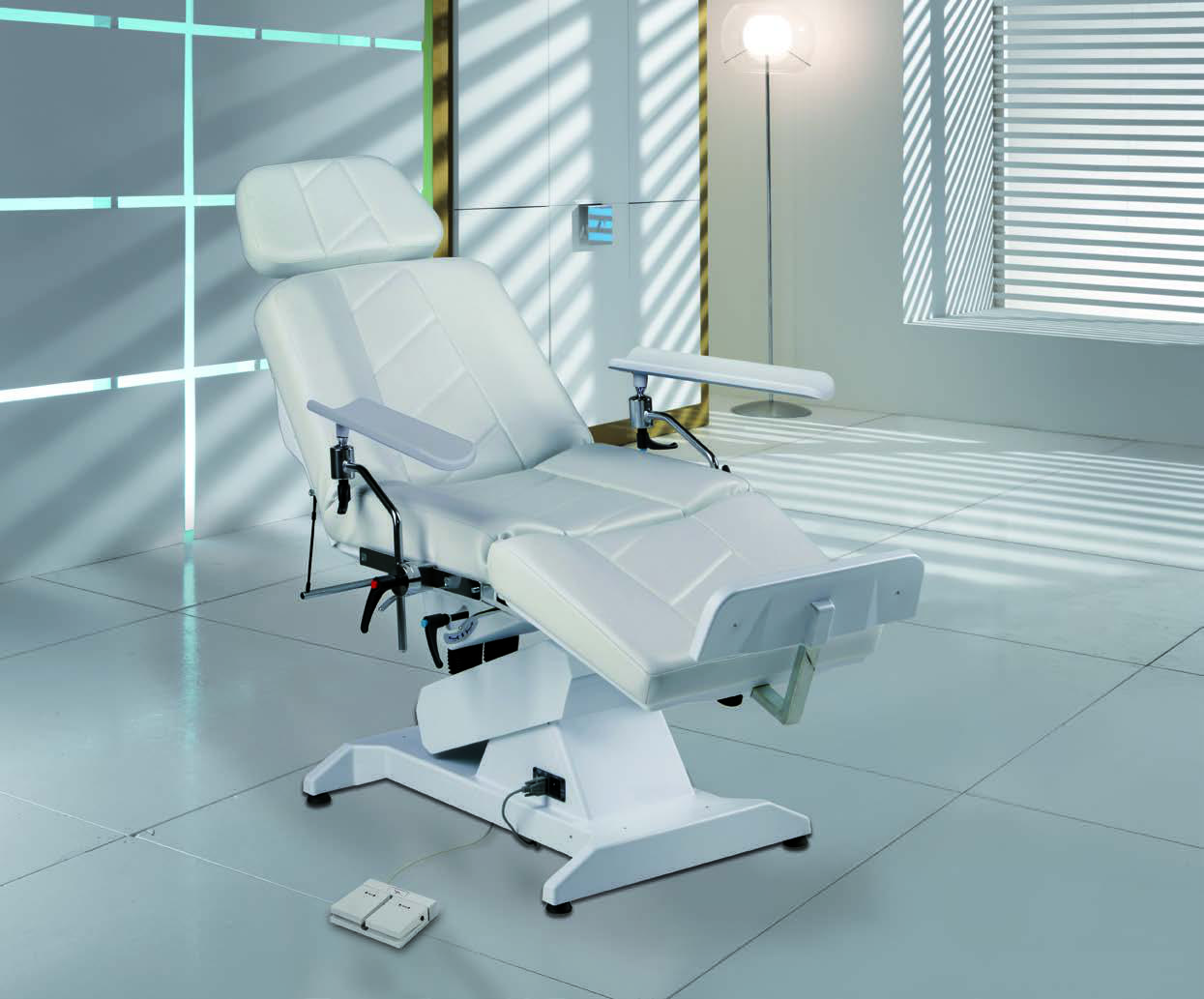 В данной модели используется один электропривод для настройки положения кресла. Высота регулируется за счет гидравлической системы. Остальные элементы конструкции настраиваются механически. Анатомический матрас делает все процедуры более комфортными и удобными для пациента.
