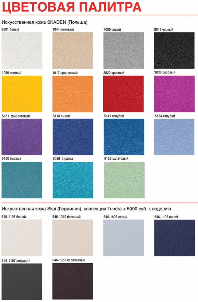 Кресло поставляется в собранном виде. Каркас кресла изготовлен из стальной профильной трубы с порошковым полимерным покрытием, устойчивым к ударам, сколам и к обработке всеми видами дезинфицирующих растворов. Мягкие элементы выполнены из водостойкой фанеры, поролона, покрыты искусственной кожей, устойчивой к истиранию, химическим дезинфектантам и УФ-излучению. Цвет обивки – по желанию заказчика.