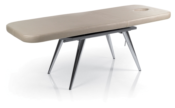 Кушетка массажная прямоугольной формы. Кушетка оснащена электромотором, с помощью которого регулируется высота, регулировка осуществляется за счет ручного пульта управления, наклон спинки регулируется механически. Также кушетка оснащена матрасом с отверстием для лица. Каркас кушетки, изготовленный из металла, обеспечивает высокое качество и прочность. Обивка - искусственная кожа высшего качества.