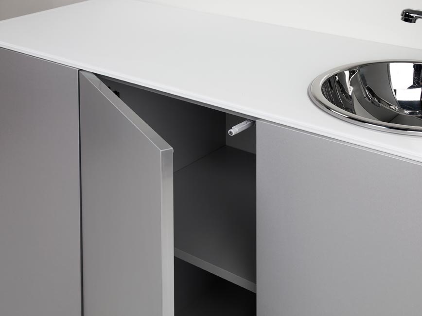 Модульная система лаборатории "MODE" - это оригинальный дизайн, удобство и функциональность. Каркас лаборатории выполнен из ламината серого цвета. Напольные тумбы оснащены столешницей из прочного стекла. Ножные опоры из алюминия.