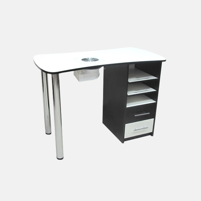 Маникюрный стол «Хирономо» - для тех, кто ищет по-настоящему изысканные решения для своего маникюрного салона или кабинета. Оригинальная форма столешницы, хромированные ножки, вместительная тумба – все это здесь. На нижней полке может быть установлена вытяжка для еще более комфортной работы мастера маникюра.