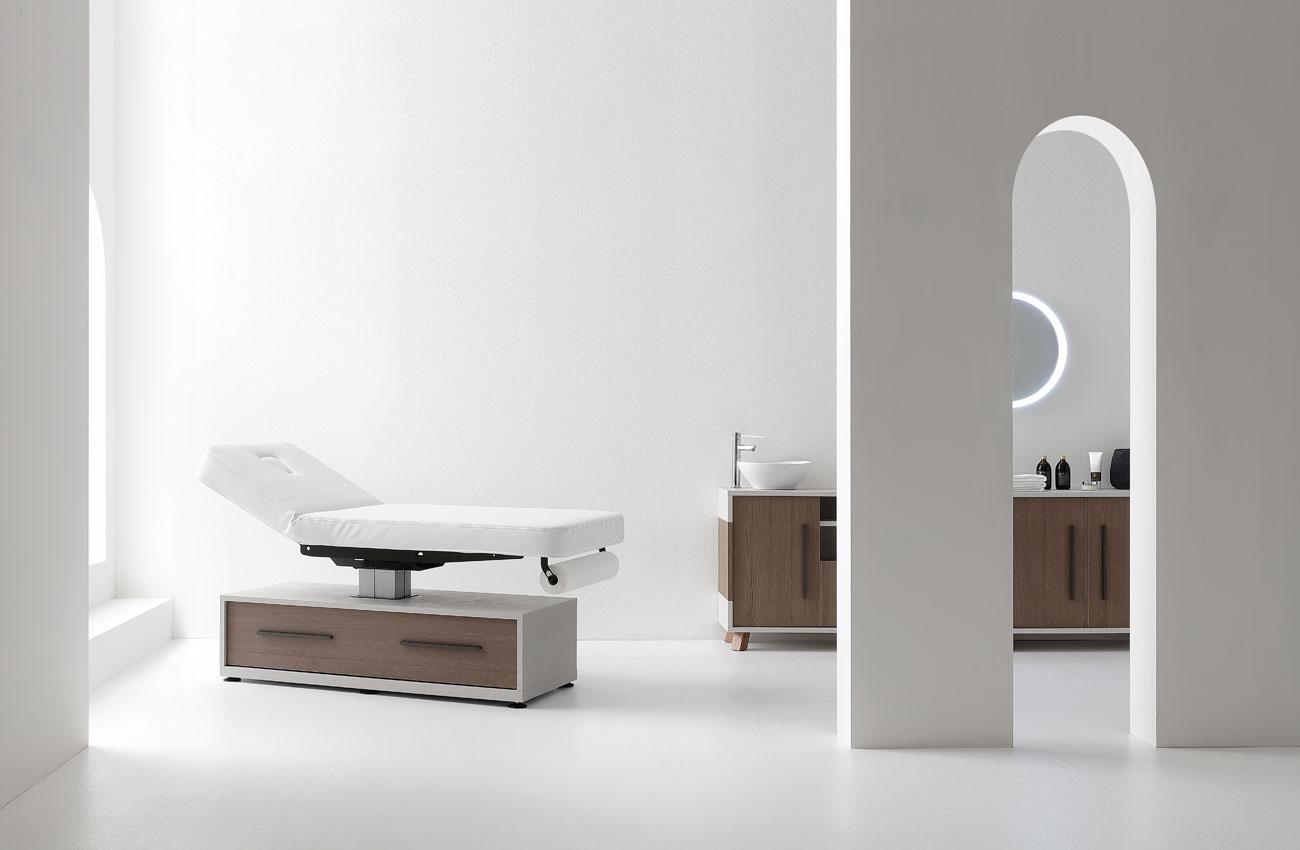 Массажная кушетка "the Minimal" - с колонной и спинкой, электрически регулируемой. Матрас с отверстием для лица с колпачком. Отсек с откидной дверцей с алюминиевой ручкой, отделка свинцово-черная. Оснащена держателем рулона.