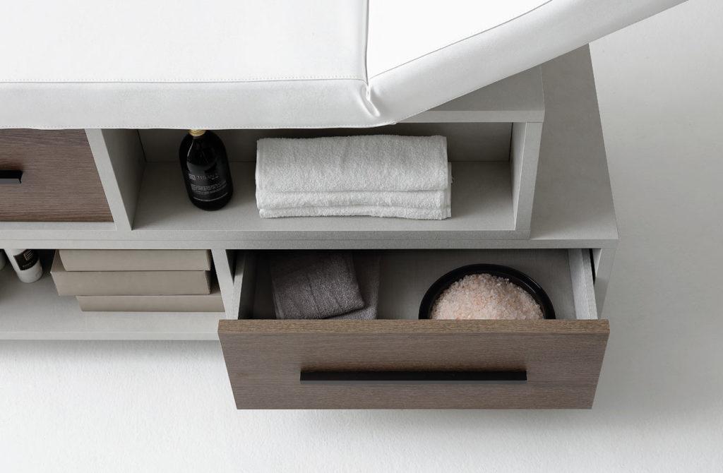 Массажная кушетка "The Wall" - оборудована двумя выдвижными ящиками, выдвижной полкой для косметического оборудования, экспозиционными отсеками для продуктов, большим отсеком для оборудования. Фронтальные ящики оснащены алюминиевыми ручками, отделка свинцово-черная. Регулируемая спинка. Оснащена держателем рулона и деревянными ножками.