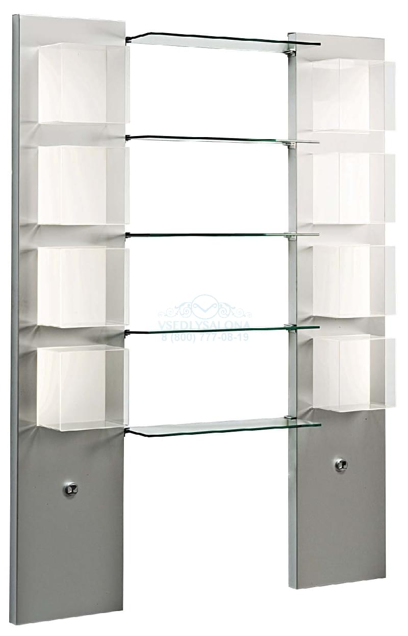 Алюминиевая настенная витрина с подсветкой, состоит из двух панелей соединенных между собой стеклянными полочками. Размер (ДхШхВ): 140х37,5х187