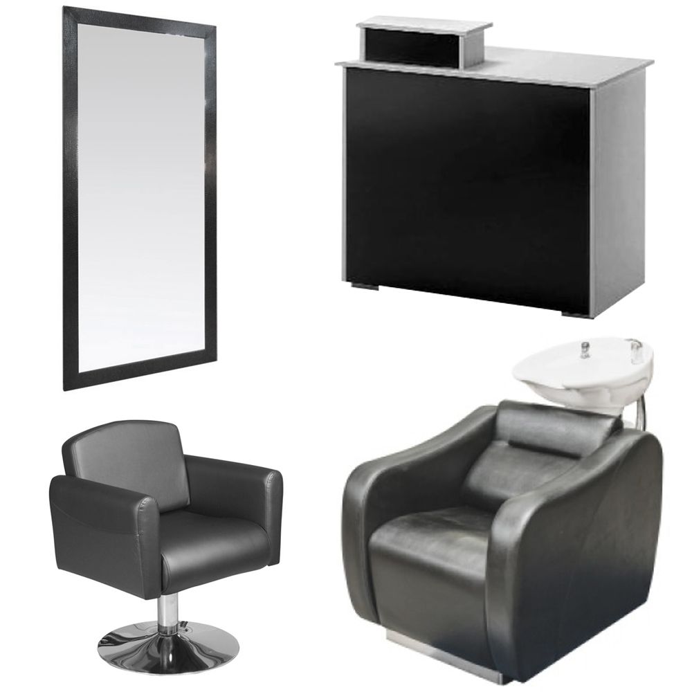 Парикмахерский комплект «Глум» состоит из четырех предметов – стойки администратора, парикмахерского кресла, одностороннего вертикального зеркала и мойки. Дизайн выполнен в строгом и сдержанном стиле, производитель использует ламинированный ДСП и искусственную кожу черного цвета. Металлические элементы изготовлены из хромированной стали.