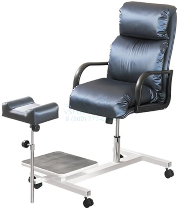 Группа педикюрная ПГ-01 производства российской компании с мягким элементом из искусственной кожи, пластиковыми подлокотниками черного цвета. Кресло регулируется по высоте с помощью пневматического подъемника и имеет механизм качания. В комплект так же входит подставка для педикюрной ванночки и подставка для ноги, регулирующаяся по высоте. Каркас металлический белого цвета на колесиках с блокировкой. Размер: (ДхШхВ) 1230х600х500 - 630