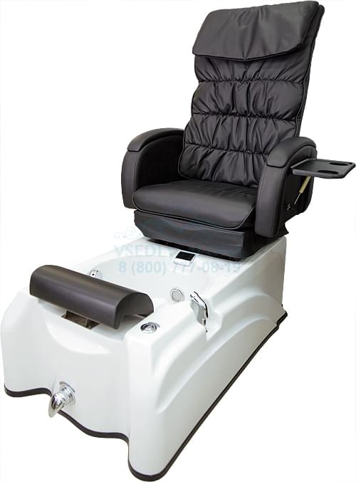 Педикюрное кресло оснащено ручным пультом управления. В спинку кресла вмонтировано 4-х колесное массажное устройство, посредством которого осуществляются 4 вида массажа. Сидение кресла оснащено функцией вибрации. Ванна кресла оснащена функциями гидромассажа и подсветки. Угол наклона спинки и угол наклона опоры для ног регулируются механически. Регулирование сидения в скользящее положение также осуществляется вручную. Механическая регулировка положения подлокотников вверх-вниз. Мягкий элемент имеет эргономичную форму, что делает кресло функциональным, безопасным и комфортным для клиента во время проведения процедуры.