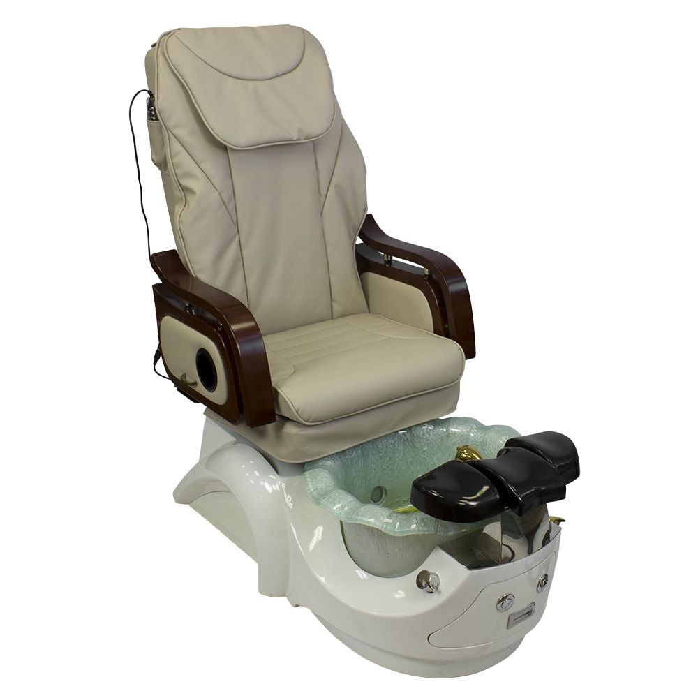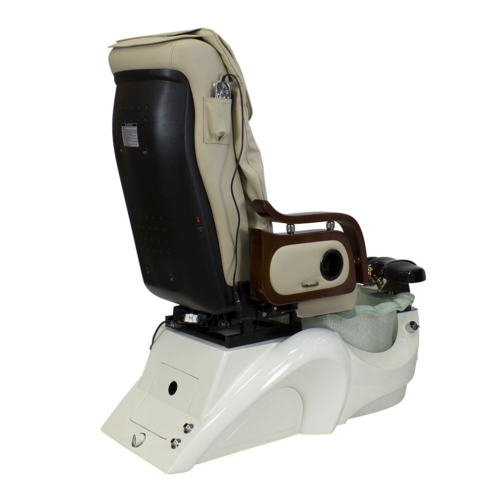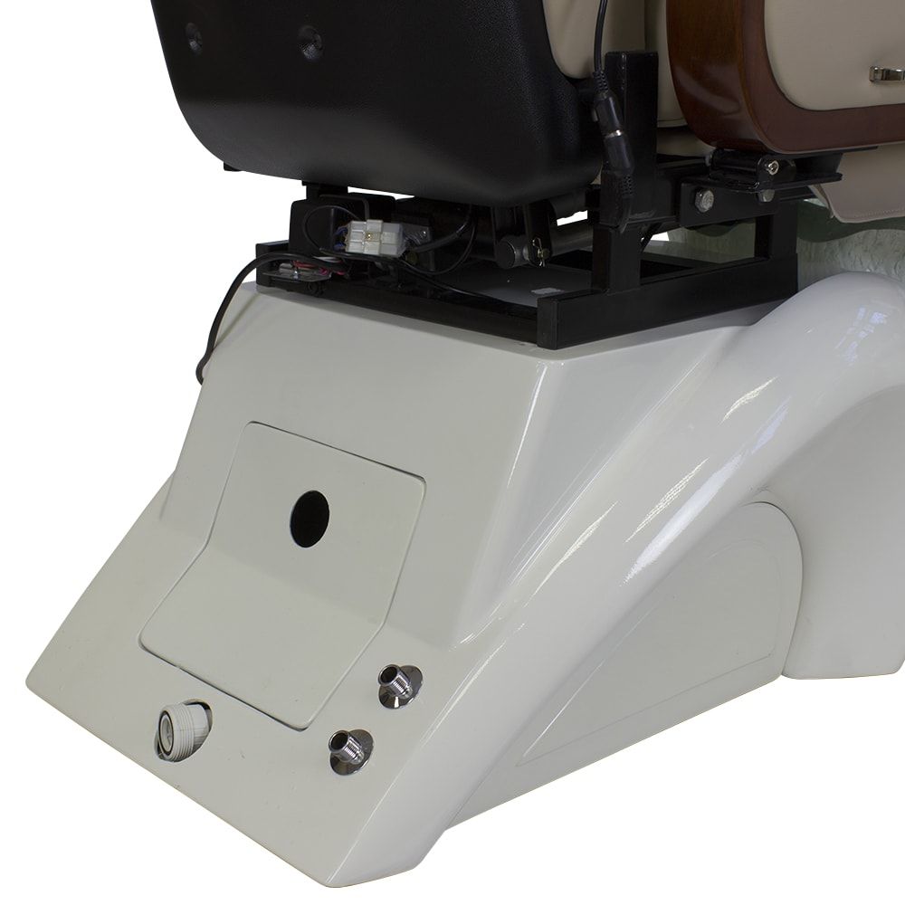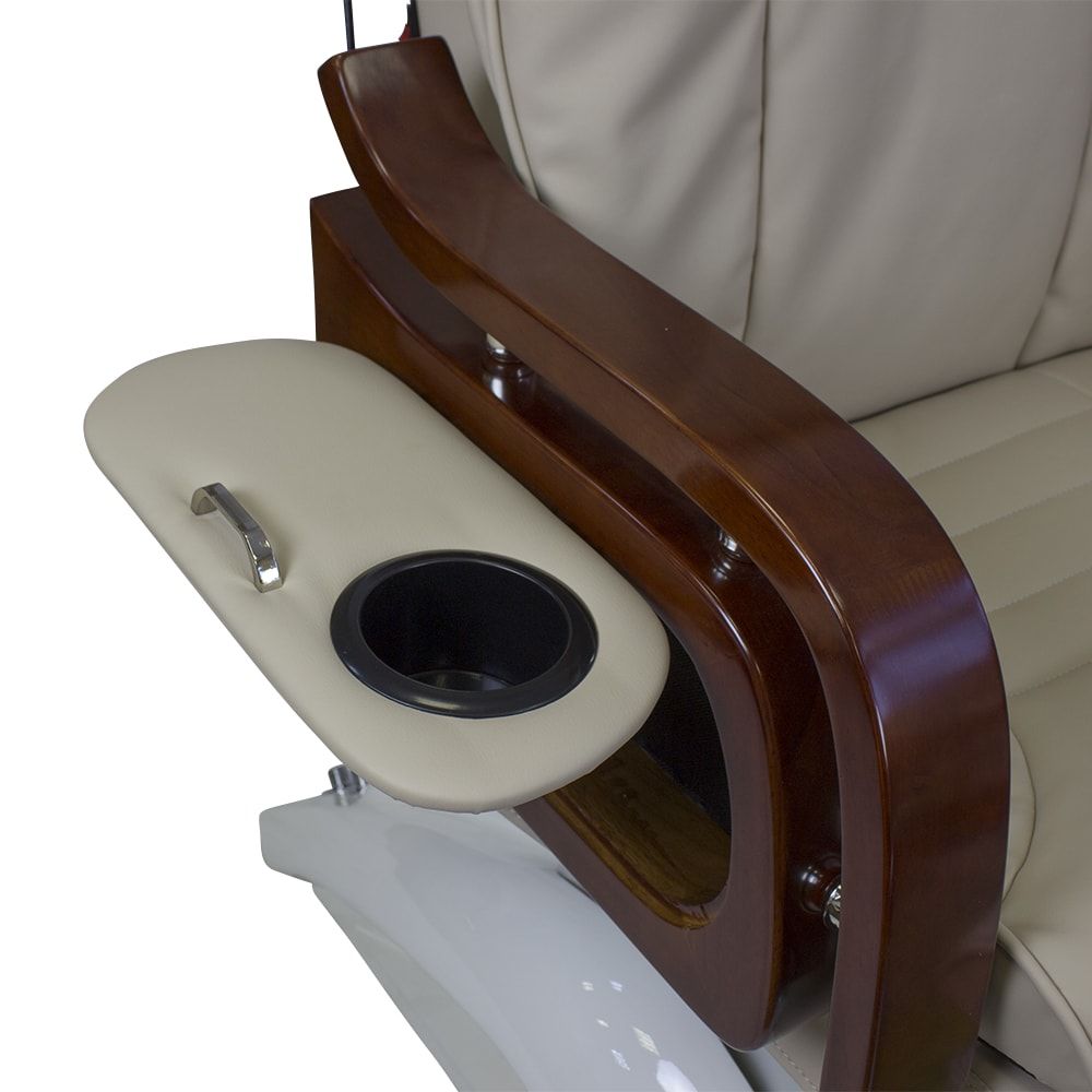 Красивое и очень удобное салонное СПА кресло для педикюра белого или нежно молочного цвета с деревянными подлокотниками в темно-коричневых оттенках отлично дополнит ваш салон. Обивка кресла выполнена в основном из натуральной кожи либо кожзаменителя высокого класса. Для максимального комфорта размещения клиента в кресло встроены мягкая подставка для ног и регулируемый подголовник. Сами ванночки для педикюра сделаны из акрилового материала. А автоматическая система подачи и слива воды позволяет упростить задачу мастера, не перенося их. В комплекте со СПА креслом идет кресло мастера.