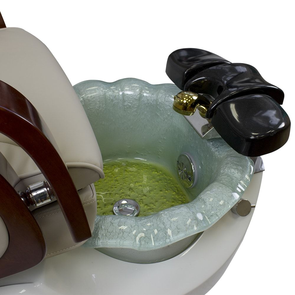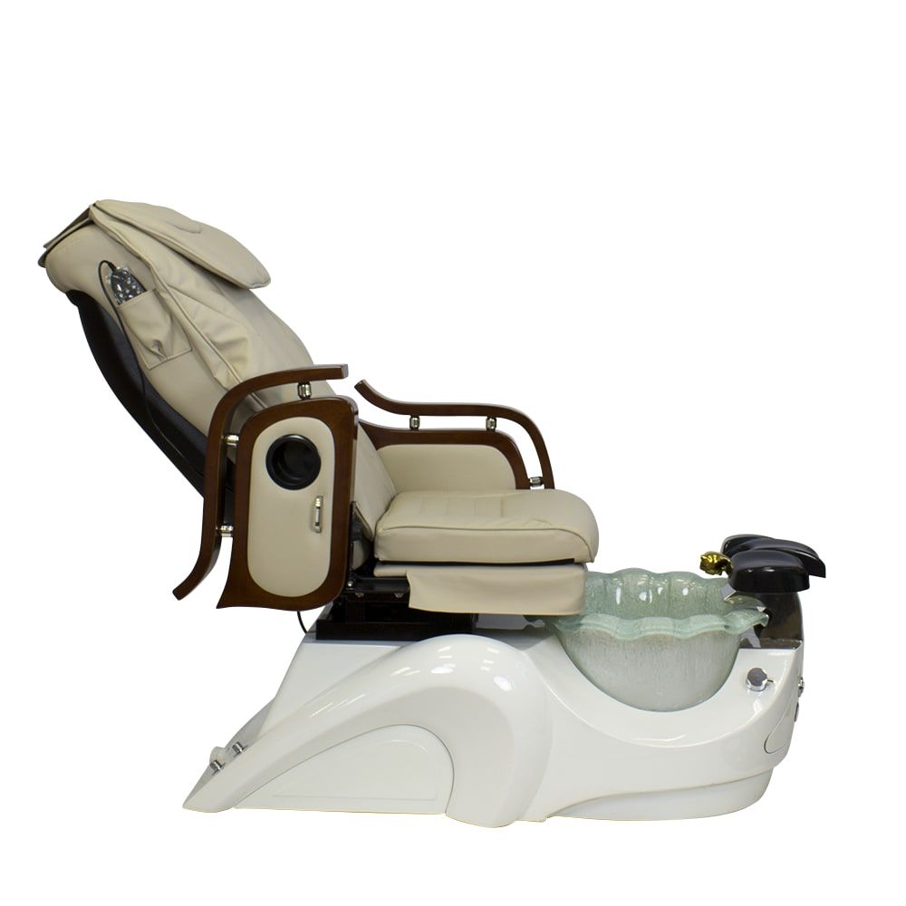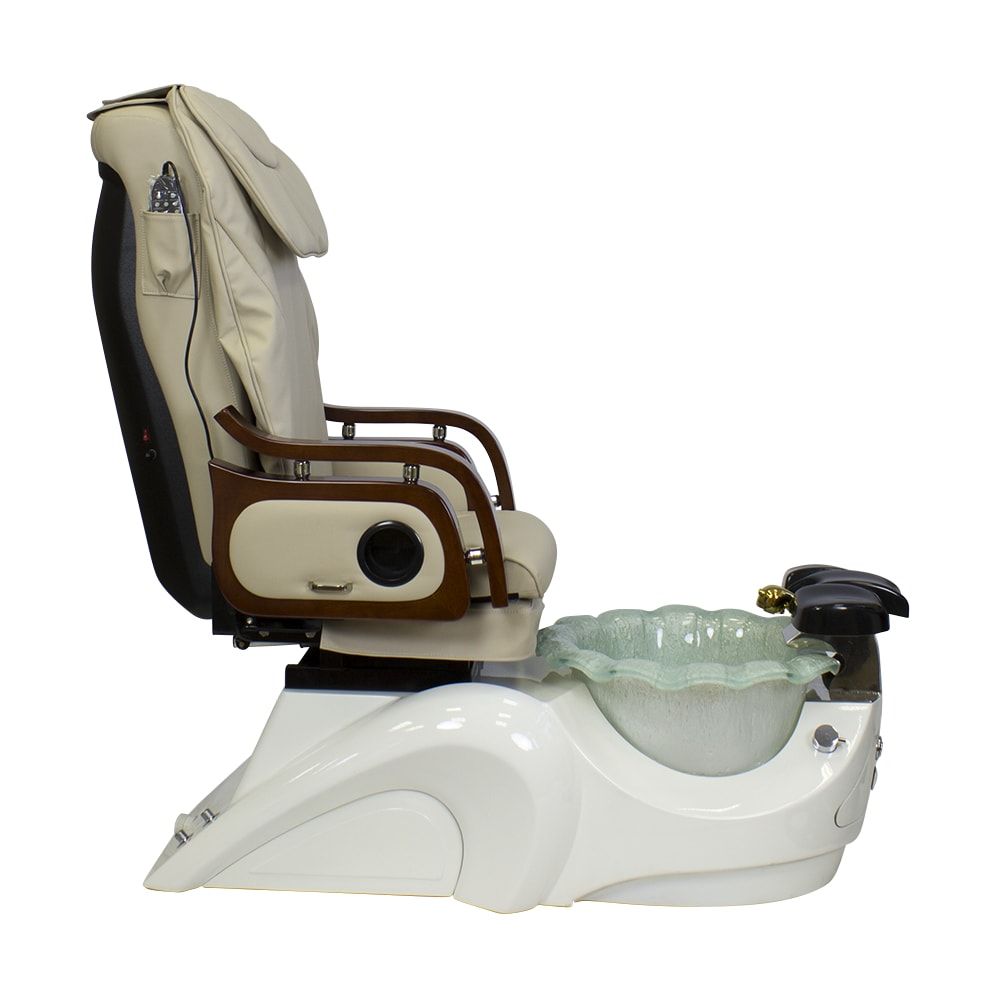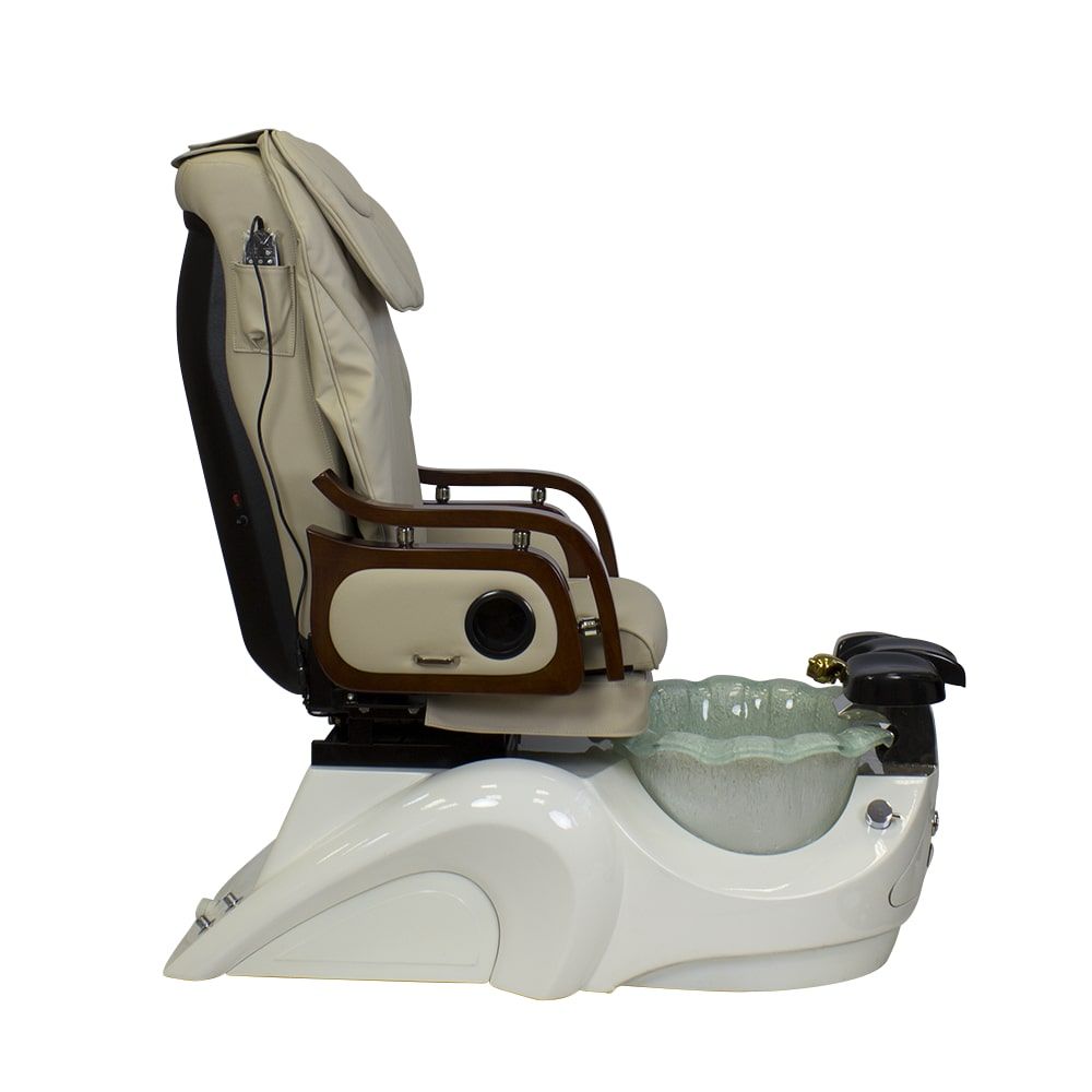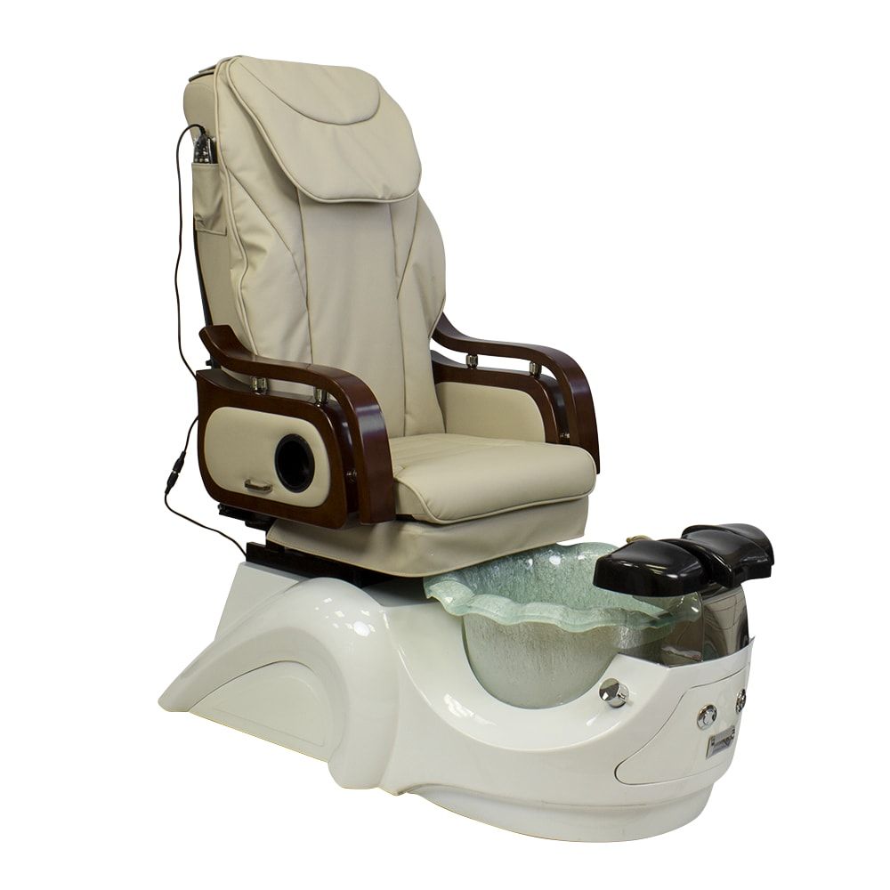 Красивое и очень удобное салонное СПА кресло для педикюра белого или нежно молочного цвета с деревянными подлокотниками в темно-коричневых оттенках отлично дополнит ваш салон. Обивка кресла выполнена в основном из натуральной кожи либо кожзаменителя высокого класса. Для максимального комфорта размещения клиента в кресло встроены мягкая подставка для ног и регулируемый подголовник. Сами ванночки для педикюра сделаны из акрилового материала. А автоматическая система подачи и слива воды позволяет упростить задачу мастера, не перенося их. В комплекте со СПА креслом идет кресло мастера.