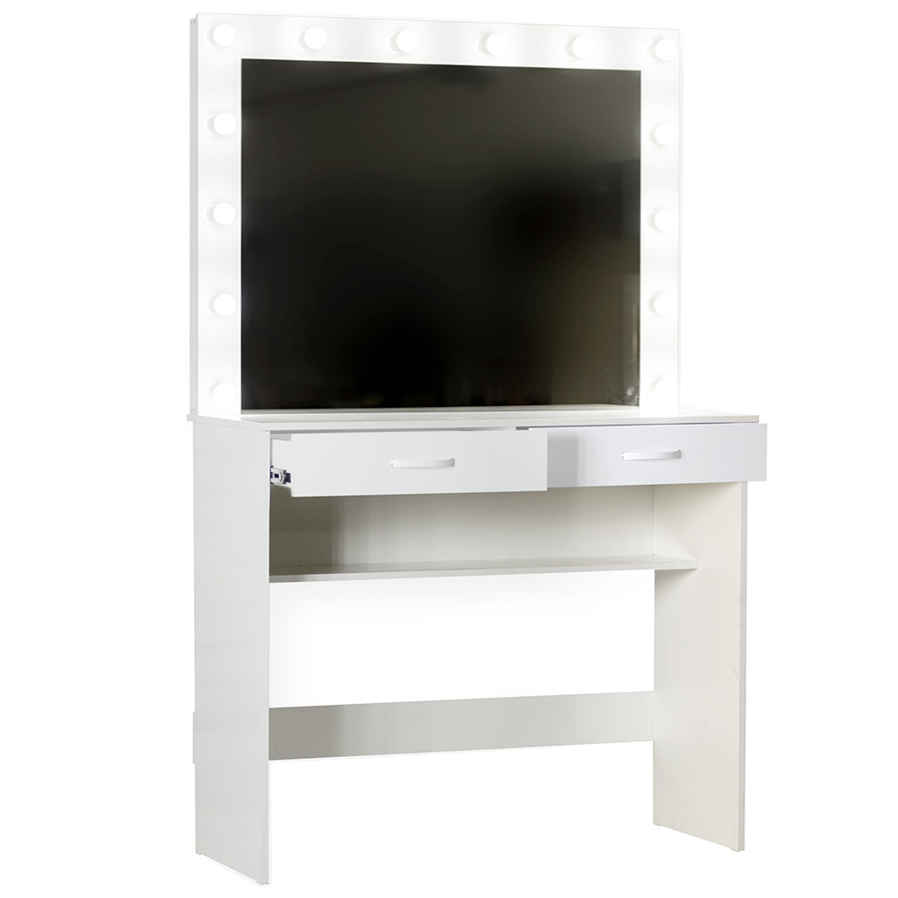 Комплектация: зеркало с подсветкой, столик, два выдвижных ящика.