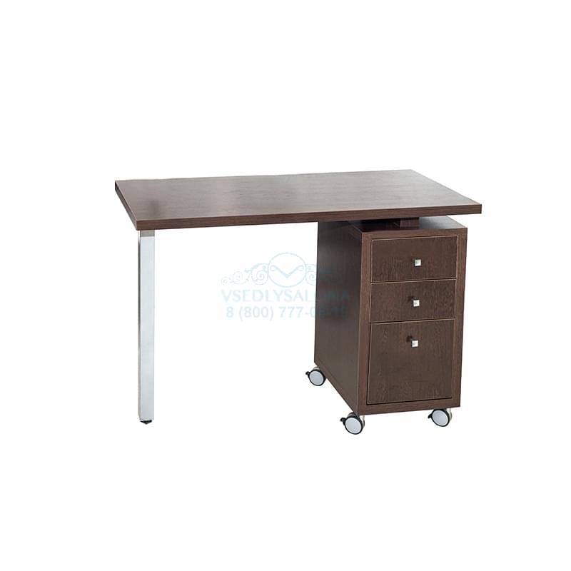 Маникюрный стол классического дизайна из ламинированного ДСП с квадратной ножкой и тумбочкой. Тумбочка оснащена тремя выдвижными ящиками, нижний ящик идеально подходит для хранения высоких флаконов. Базовые цвета: венге, белые цветы. Габаритные размеры (ДхШхВ): 115х50х75 см. Возможно изготовление под заказ в различных цветовых вариантах.