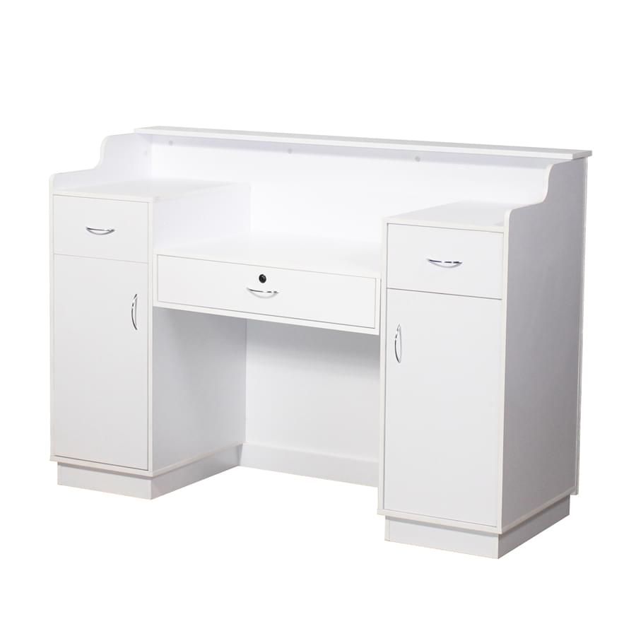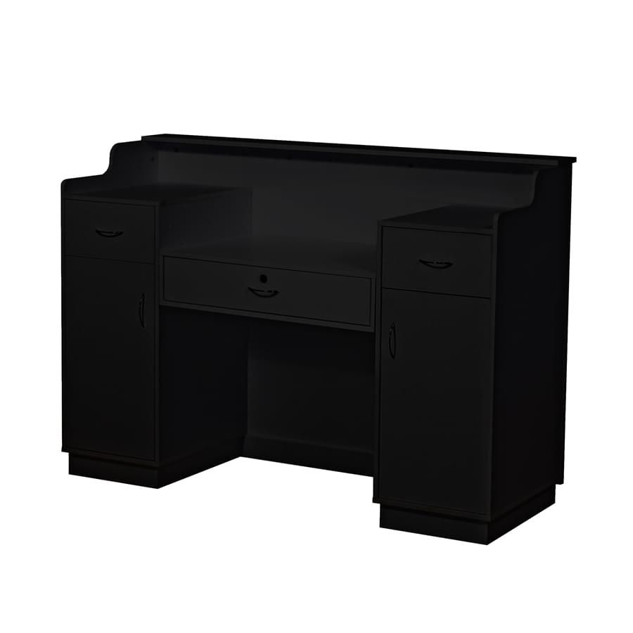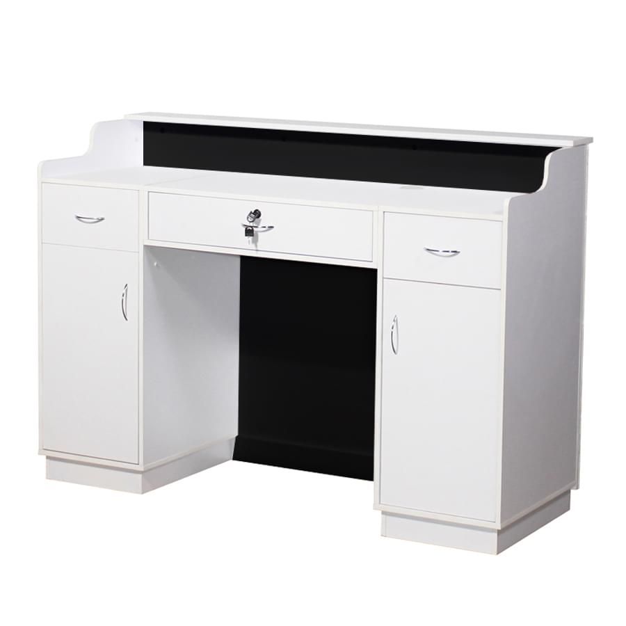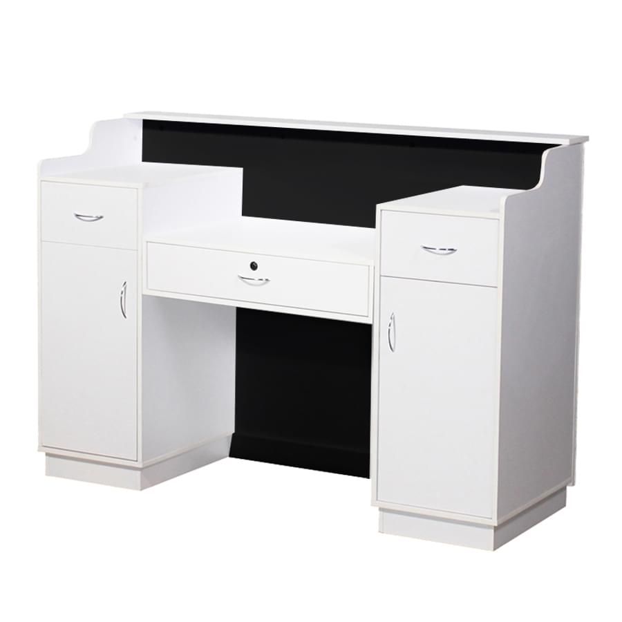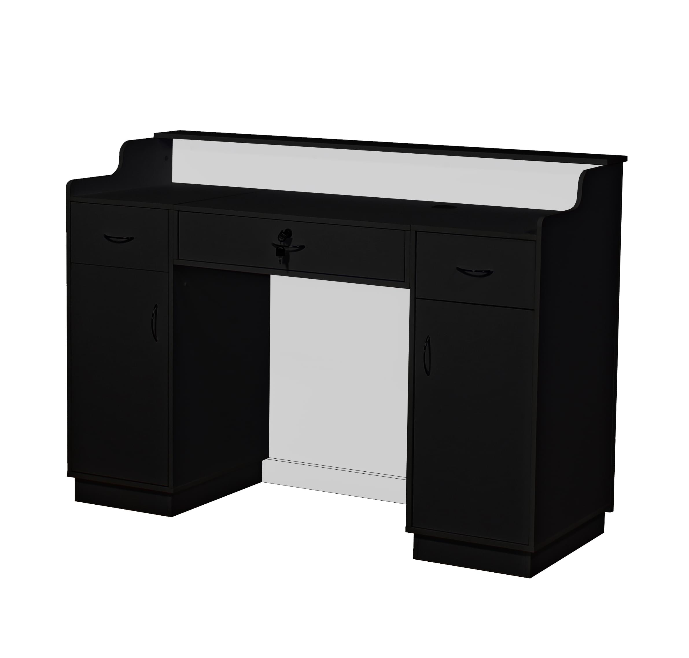 Стойка оснащена столешницей с ящиком на замке и двумя тумбами. Столешница может располагаться на одном уровне с тумбами или ниже них. Каждая из тумб состоит из выдвижного ящика и отделения с распашной дверцей. В наличии стойки из ДСП черного и белого цветов, под заказ возможно изготовление в любом цвете и размере.