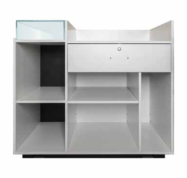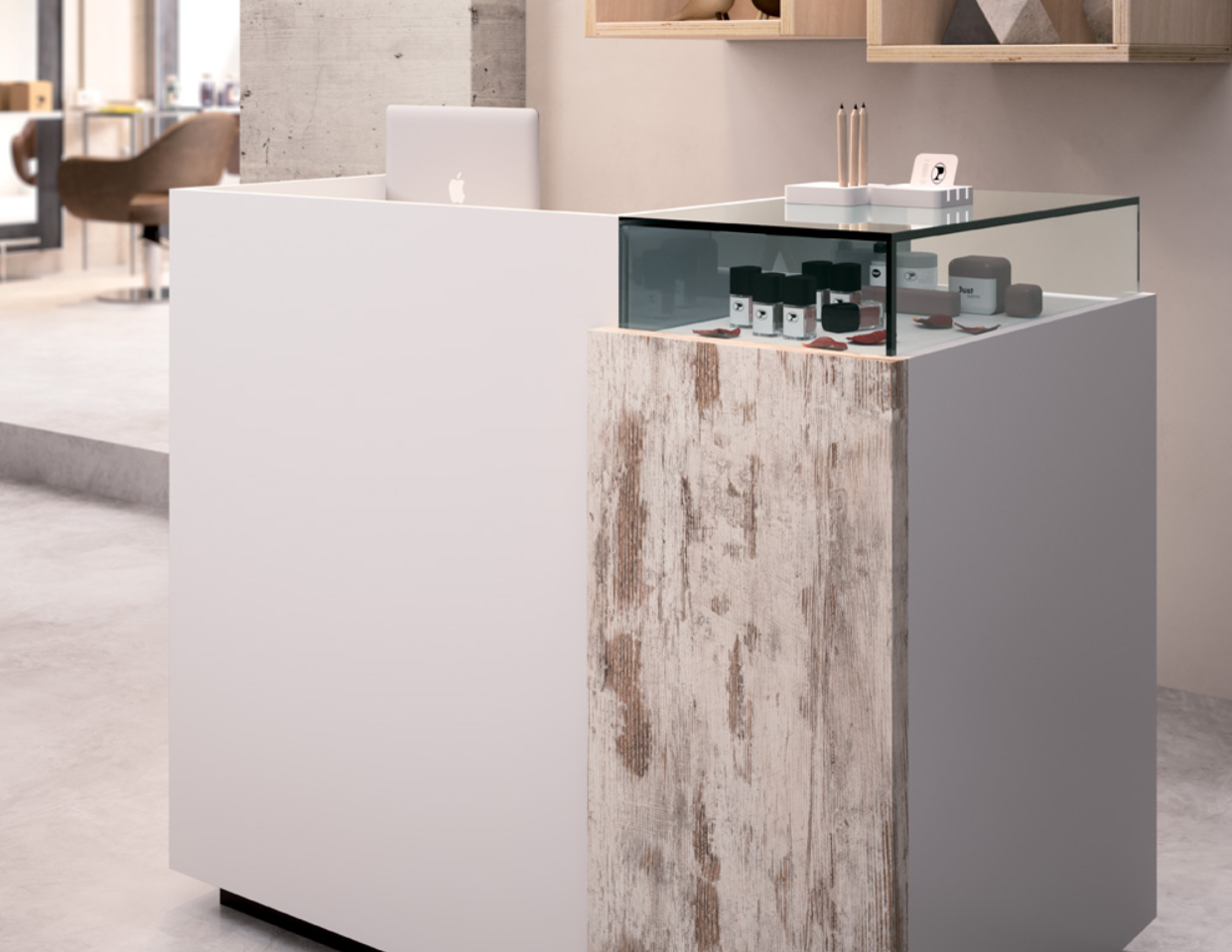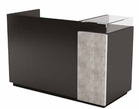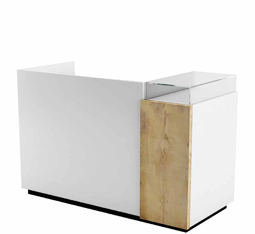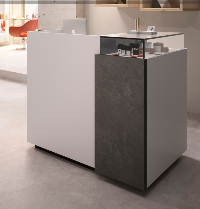 Администраторская стойка «Гламрок» выполнена в соответствующей стилистике – контрастные элементы, каретная стяжка с небольшим объемом, ярко выраженная геометрия и широкие возможности реализации индивидуального дизайна. Внешняя часть лишена мелких деталей, украшена стяжкой. Внутренняя – полноценное рабочее место для сотрудника салона.