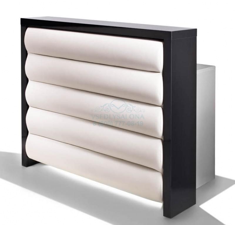 Стойка администратора, полка из черного лакированного или белого матового ламината, фасад - кожзам. Тумбы - серый ламинат. Размер (см): 123х65х110