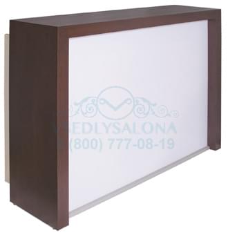 Ресепция выполнена из ламинированного ДСП, материал фасада пластик белого цвета с подсветкой. Оснащена тумбой и выдвижной полкой под клавиатуру. Цвет: венге с бежевым. Размер: (ДхШхВ) 140х72х105