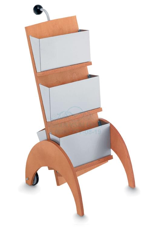 Тележка для журналов из дерева (цвет: вишня или венге) с металлическими ящиками серебристого цвета.