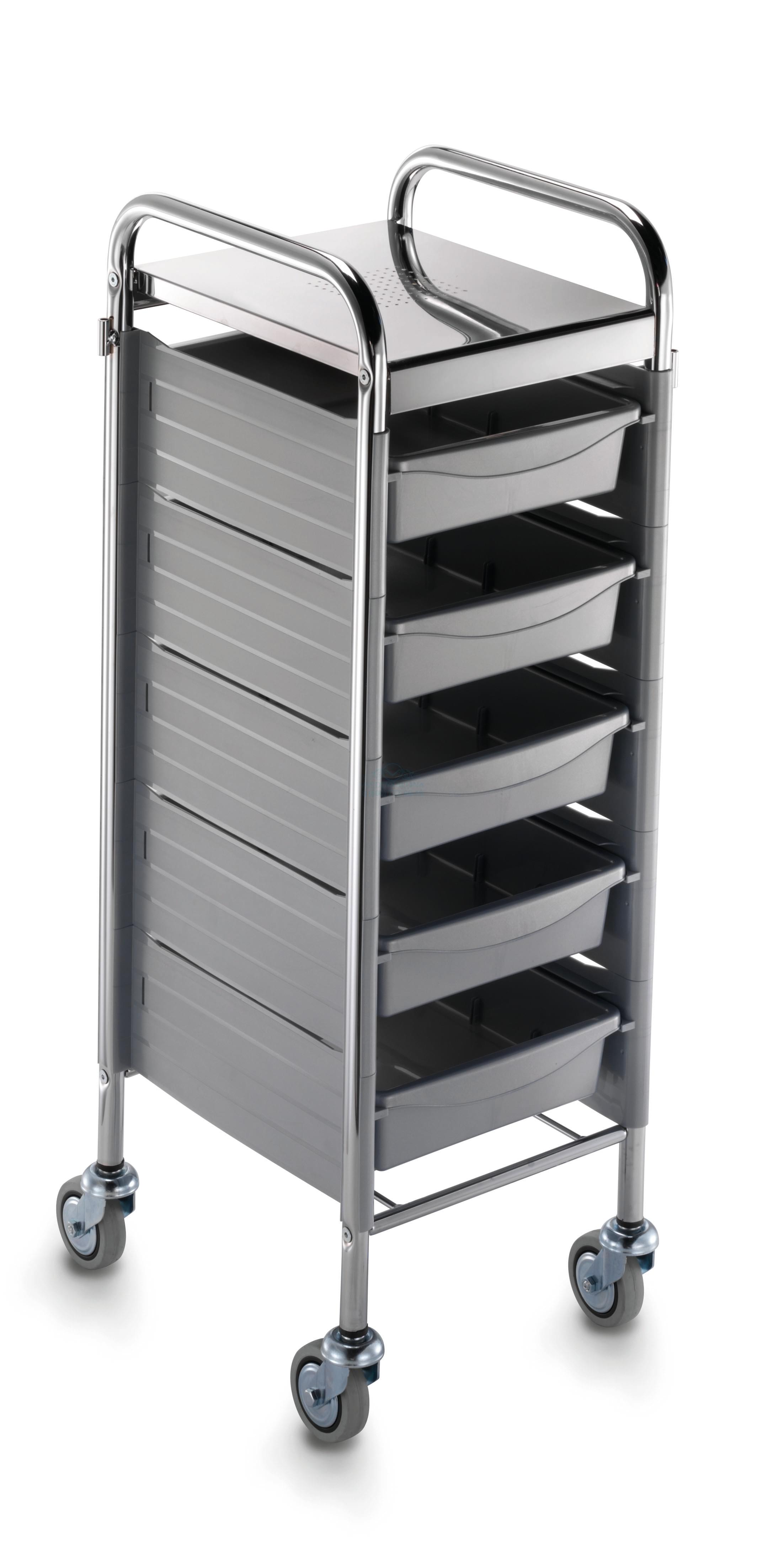Тележка парикмахерская выполнена из пластика, на колесиках, с выдвижными ящиками, крышка – металл хром.