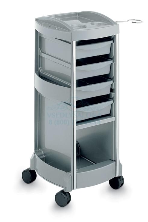 Тележка парикмахерская, передвижная на колесах. С отверстиями для брашеров, держателем для фена, с выдвижными ящиками. Материал - пластик. Цвет - серебро, черный. Размер 42х43х93
