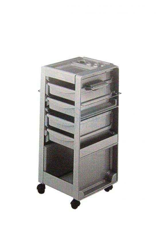 Парикмахерская тележка Т-30 оснащена глубокими и вместительными ящиками для парикмахерских принадлежностей, а также фенодержателем для еще большего удобства работы. Она выполнена в классическом черном цвете, что делает ее универсальной моделью практически для любой современной парикмахерской или барбершопа.