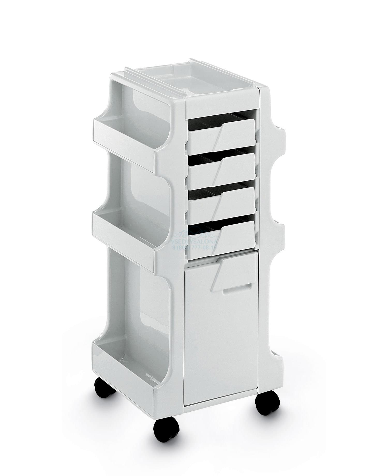Тележка парикмахерская выполнена из пластика, на колесиках, с выдвижными ящиками. Цвет: белый