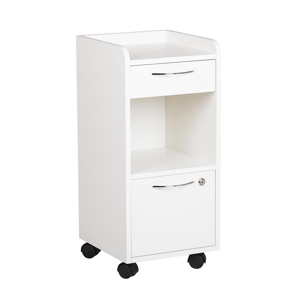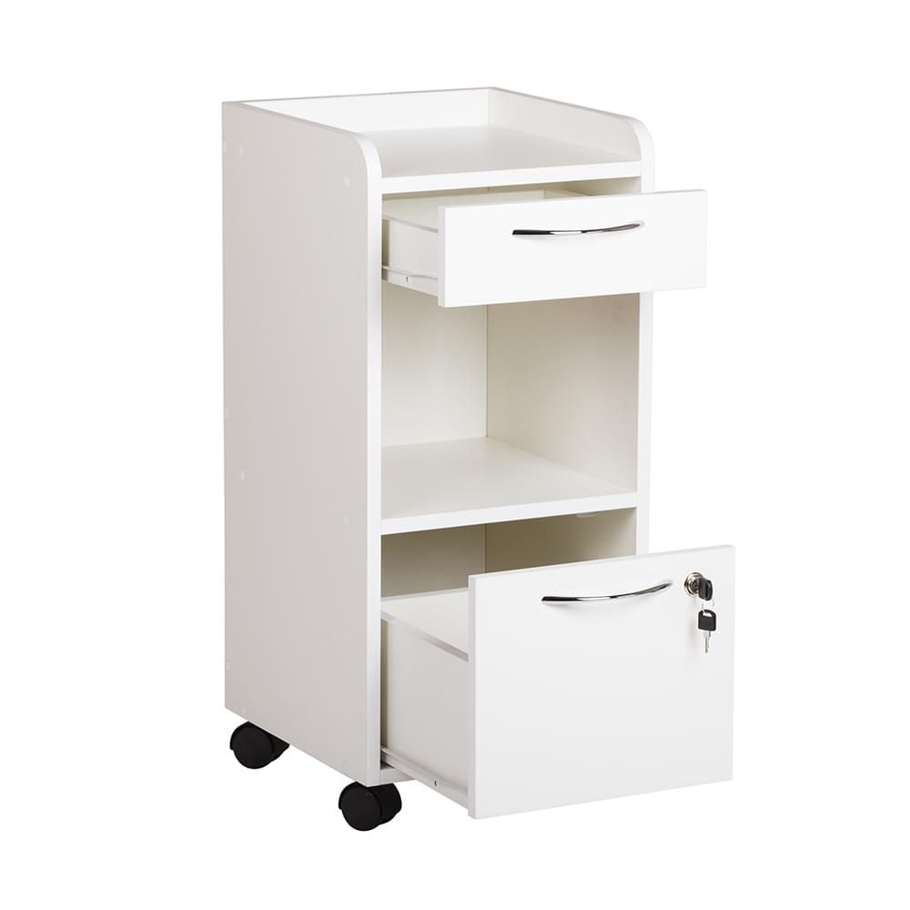Тележка представляет собой тумбу на колесных опорах с одним открытым отделением и двумя выдвижными ящиками, один из которых с замком. Цвет ламинированного ДСП любой из представленных на сайте.