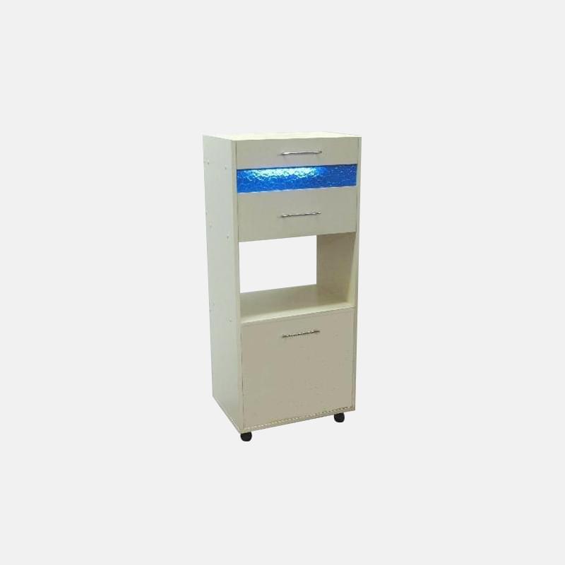 Тумба Тэкито устроена весьма удобным способом: условно ее можно поделить на несколько частей. В первой части находится бактерицидная УФ лампа, с помощью которой мастер сможет в быстрые сроки простерилизовать рабочие инструменты. Вторая часть плавно отделяет первую от третей и являет собой пустой отсек, который можно заполнить разными предметами для упрощения рабочего процесса. Третья часть — это большой ящик, с помощью которого можно хранить разного рода мелочь, которую необходимо скрыть от посторонних глаз. Таким образом, с помощью данной мебельной конструкции можно существенно сэкономить пространство салона.