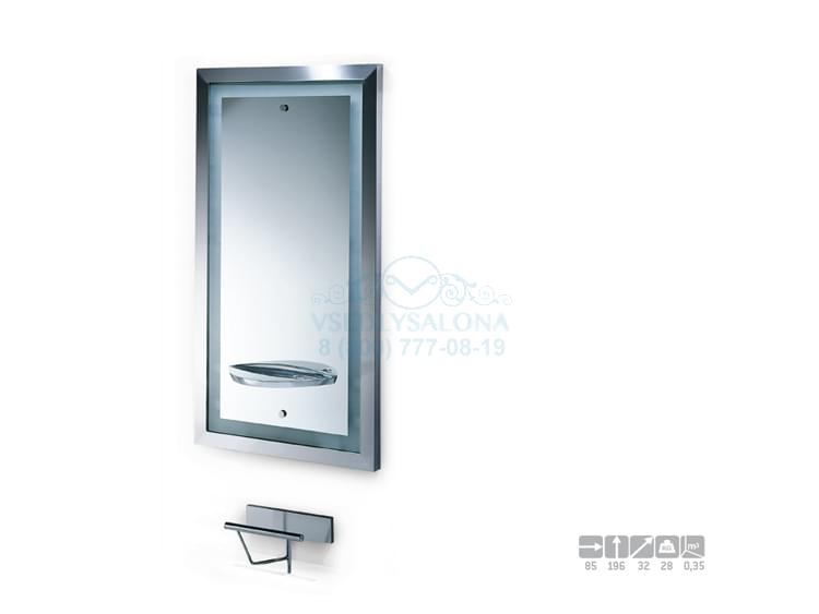 Зеркало парикмахерское одностороннее, крепление к стене, стальная рама с голубым оргстеклом, с круглой или квадратной алюминиевой столешницей. Подставка под ноги заказывается отдельно, как дополнительная опция. Размер (ДхШхВ):196х85х32